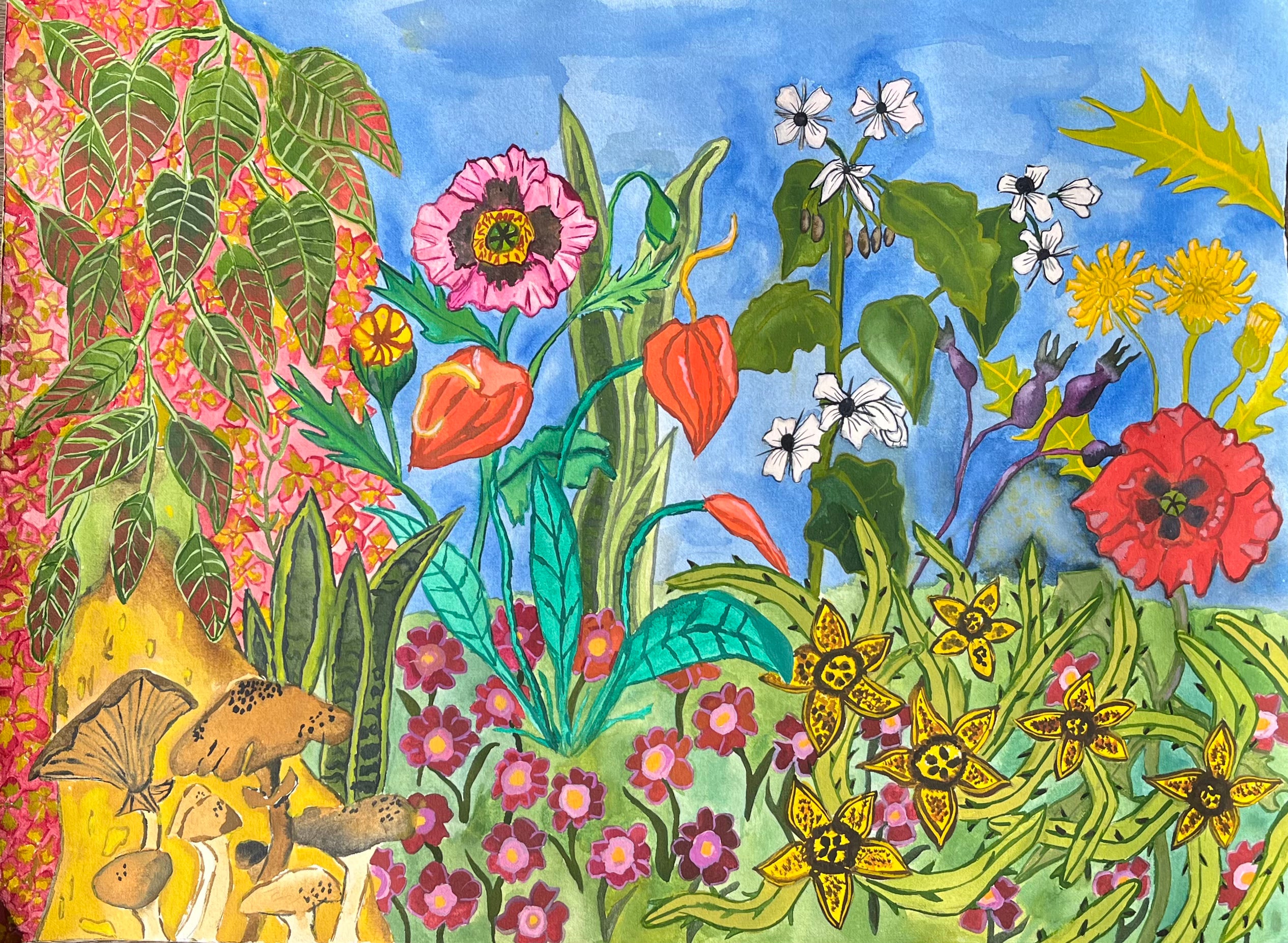 The Botanical Breeze Shirt began as this painting. Its colors and textures inspired the textile design, and now the original artwork is available as a print—bringing the story full circle, from canvas to cloth to wall. Find the print category at the top of the page.