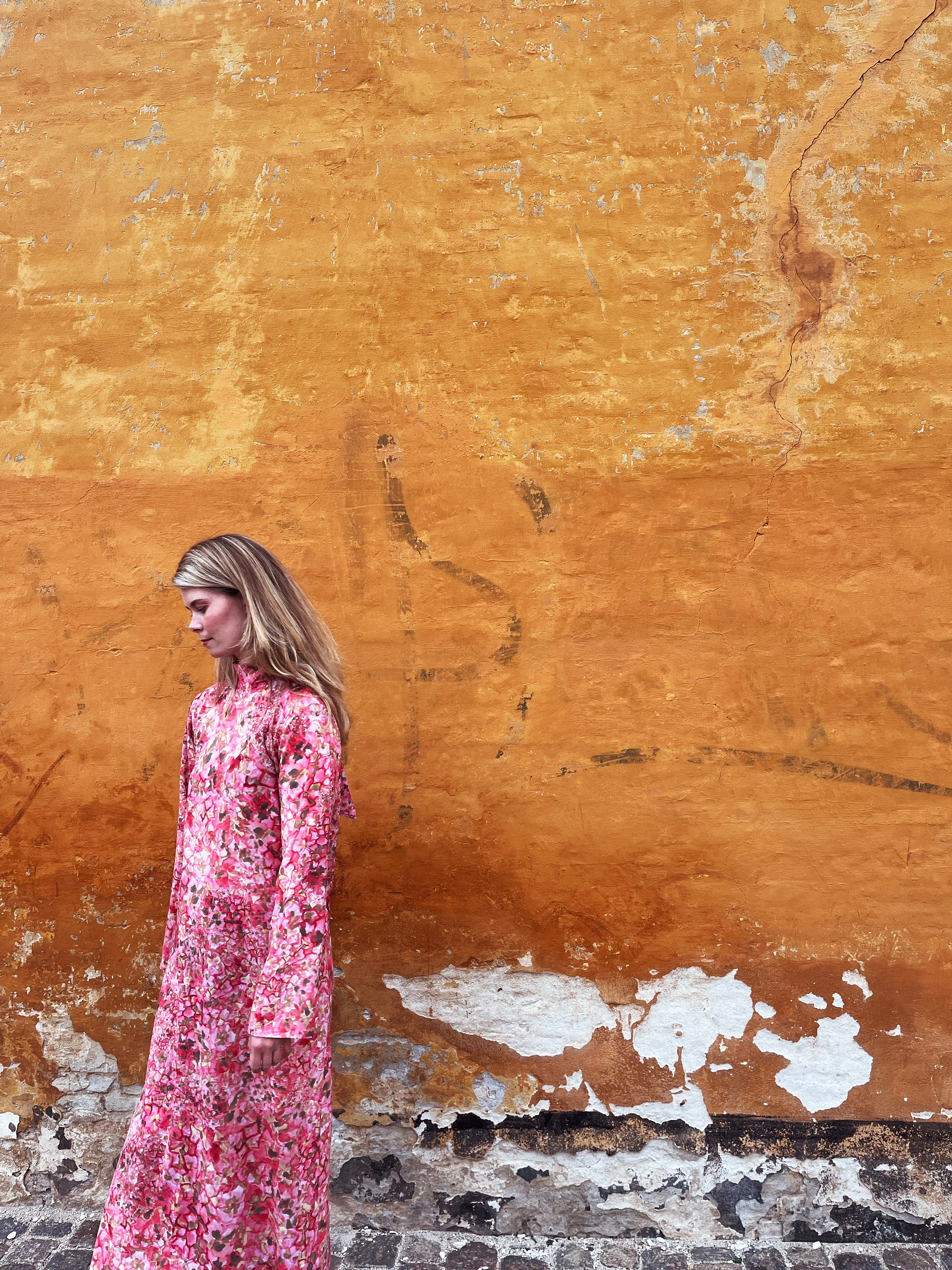 The Flore Print Dress began as a painting. Its colors and composition inspired the textile, and today the original artwork is available as a print—an elegant link between art and fashion. Find the print category at the top of the page.